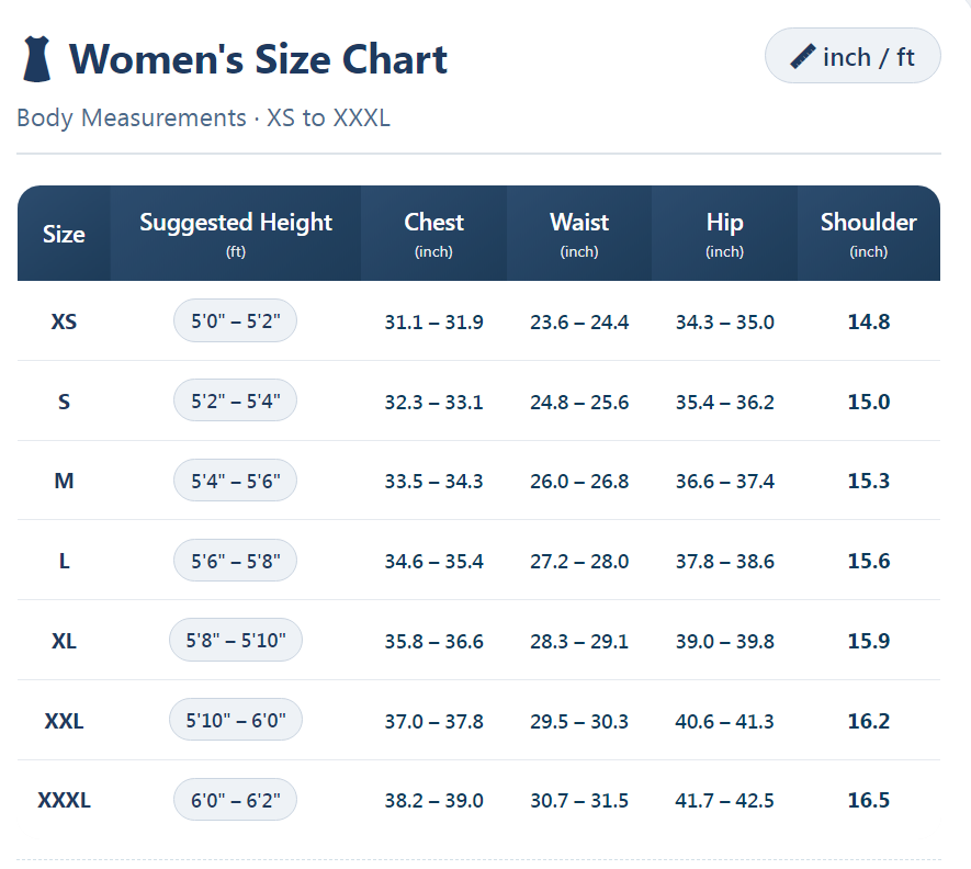 - Size Chart: