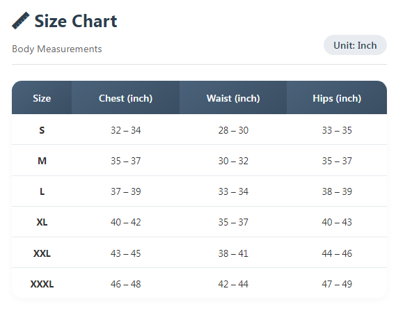 - Size Chart: